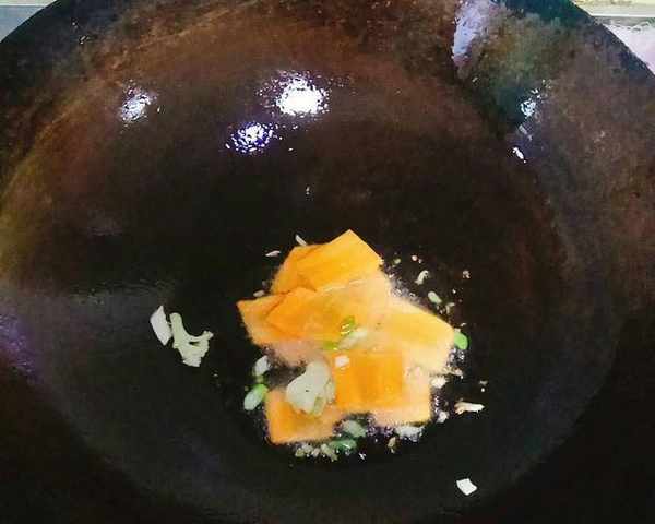 5.鍋裡加油,放入胡蘿卜和大蔥邊不停翻炒均勻