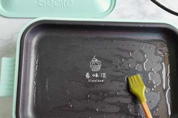 3.把面糊放一邊靜置片刻,備個不粘的平底鍋,我選瞭多功能不粘煎盤,倒入少許食用油
