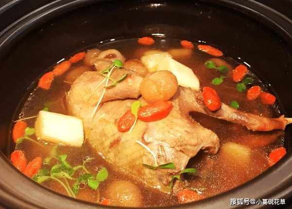 讓我們開始燉湯吧。最好有鍋。一鍋最適合燉湯。我們在砂鍋裡放瞭鴿肉、桂圓和阿膠棗。然後蓋上鍋蓋,用小火慢慢煮一個小時左右。時間到瞭,加入竹菇和枸杞繼續燉半小時。快熟的時候加入適量的鹽和胡椒粉調味即可食用。