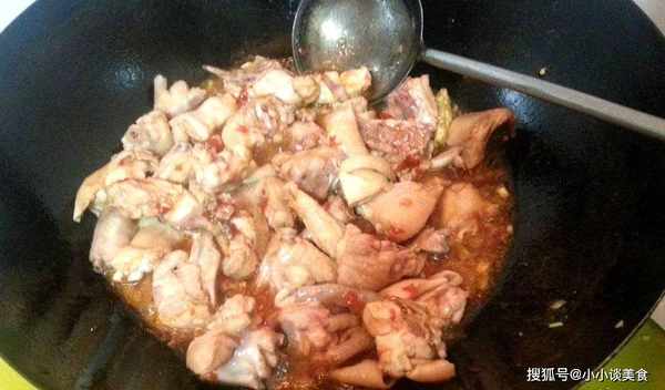 第四步:豆瓣醬炒紅油後,將之前處理好的雞肉倒入鍋中,用大火煎兩分鐘左右。鍋中加入適量的水,使水的高度與雞的高度大致相同。