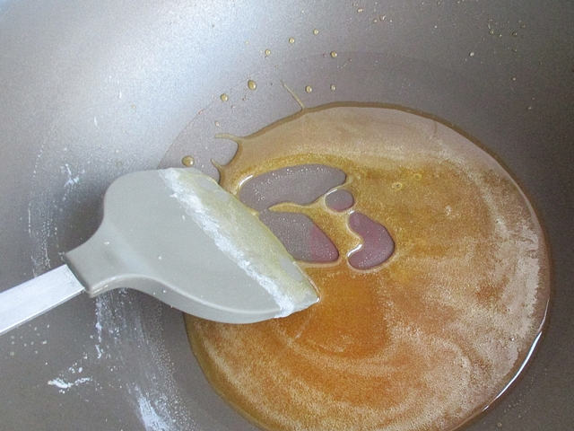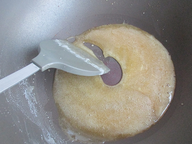 11轉成最小火,不停的攪動,這時,糖色變成棕黃色,用鏟子鏟起糖汁,從高處滴下,已可見有拉絲狀態。煮糖汁時一定要用心觀察,才能拔出成功的絲。