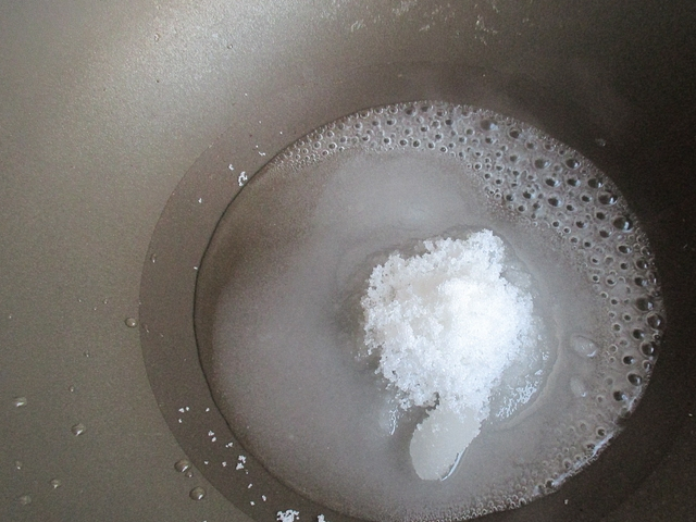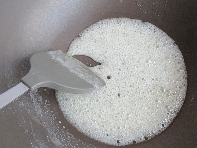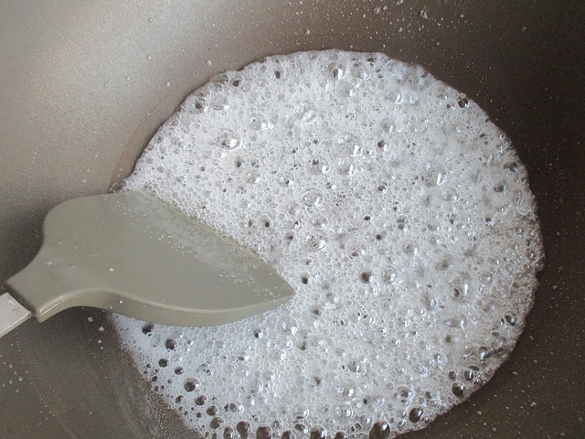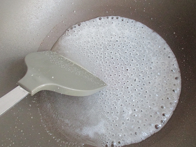 8不停的攪動,這時,鍋中的糖水是大泡的狀態