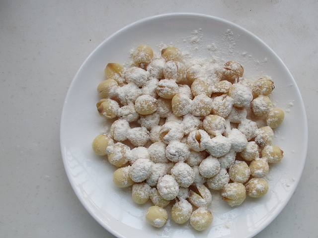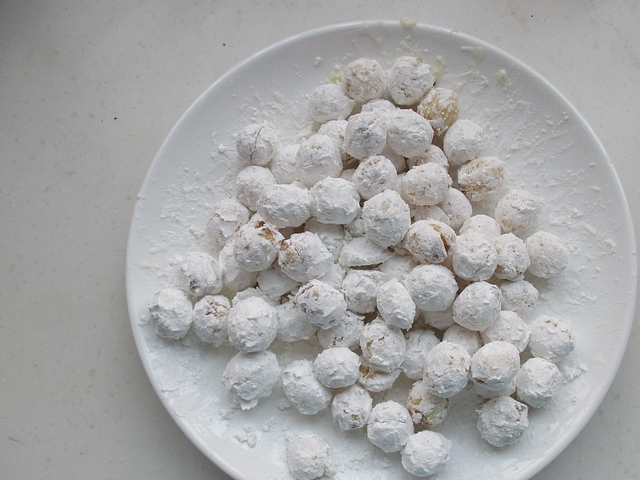 4再灑上一大勺淀粉,再次晃動盤子,使其將蓮子包裹。