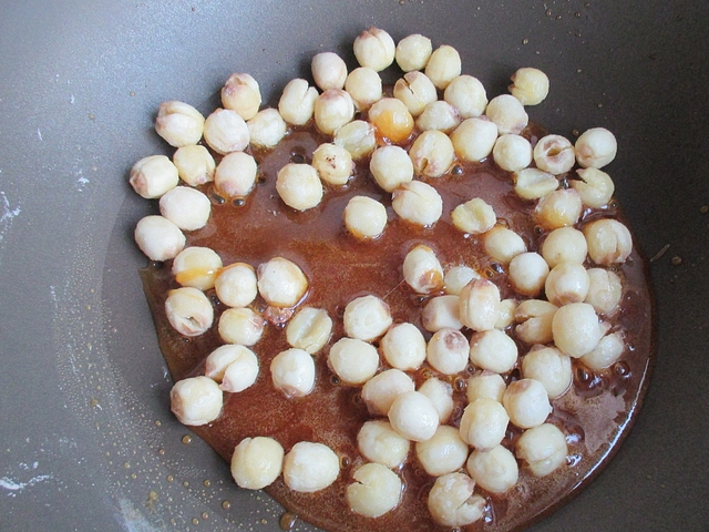 12關火,倒入炸好的蓮子,快速翻動,使糖汁均勻的裹滿蓮子,出鍋裝盤。做完拔絲的後的鍋子不用著急洗,飯後加入溫水略煮即可溶化殘留變硬的糖汁,再進行清洗,非常容易。