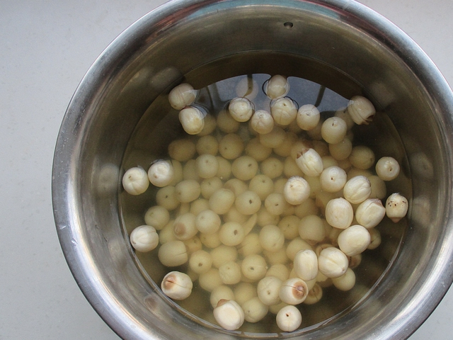 1蓮子提用冷水泡至膨大。蓮子一定要提前泡發煮熟再炸制,才能保持其軟糯的口感。