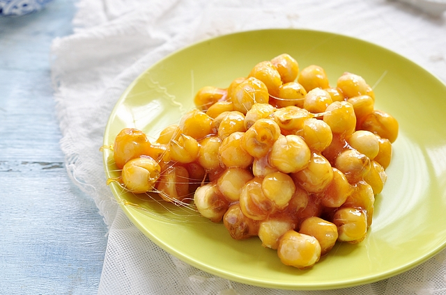 5鍋中油燒至七成熱,將蓮子放在油中,炸成表面金黃色撈出瀝油。