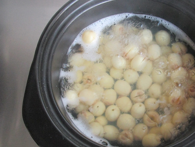 2放入鍋中,大火燒開後轉中火煮約20分鐘的時間,煮至蓮子整體變得綿軟後撈出。