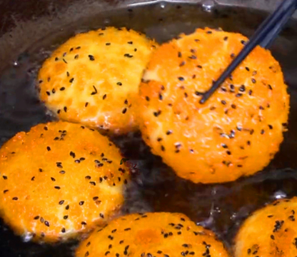 【第五步】:炒鍋裡倒入多一點的油,油溫燒至5成熱時,把餳好的玉米面餅,一個一個的放進鍋裡去炸,開中火,炸的過程中,需要不斷的翻面,讓玉米面餅都均勻受熱,