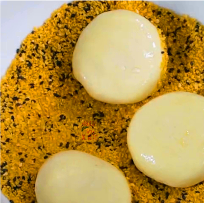 【第四步】:接下來我們需要準備面包糠和把黑芝麻,把它們放進一個盤子裡,攪攪勻後把泡過冷水的面團取出來放入盤子裡,開始搖晃,