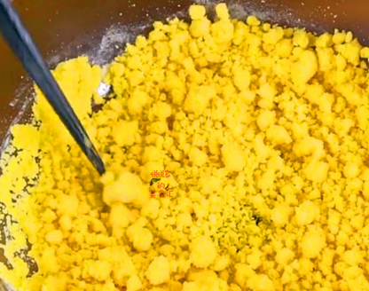 【第一步】:首先我們把細玉米面倒入一個大碗裡面,往碗裡倒入150ML的開水,把玉米面燙熟,因為玉米面沒有粘性,口感比較粗糙一些,用開水燙一下,能讓口感變得細膩,把玉米面攪拌成顆粒狀後,