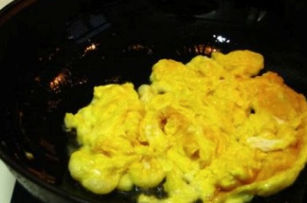 3.鍋內放入適量的油,等油熱開以後,把攪拌好的雞蛋倒入鍋中,炒好後倒出放在一邊。