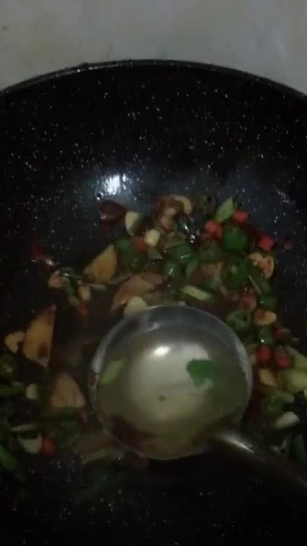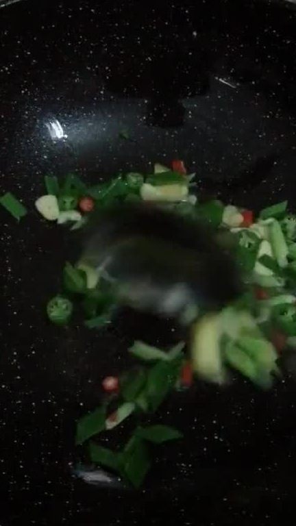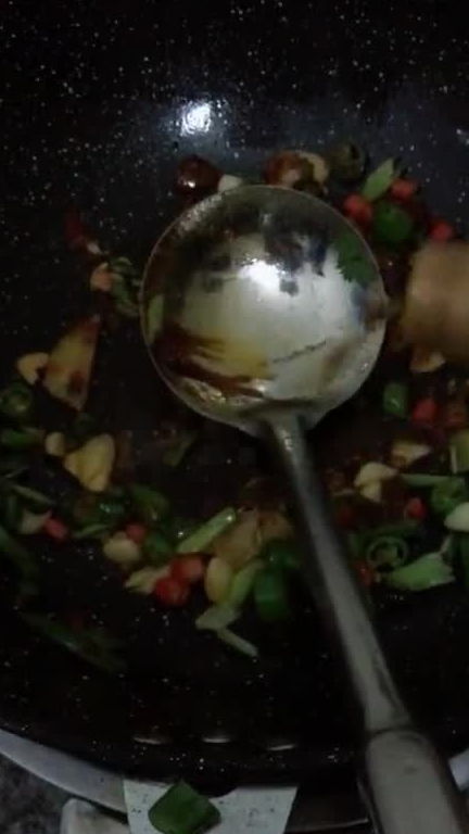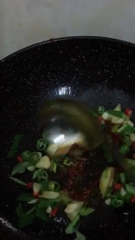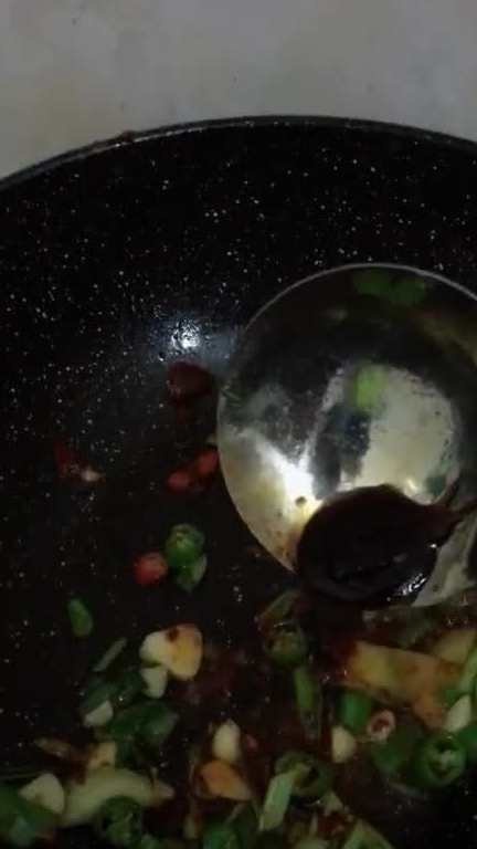 鍋中放底油,放入蔥、青蒜、辣椒,中小火煸出香味,油溫4-5成熱,效果最佳,這些辛辣的食材都是如此處理的。
