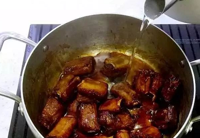 5、直到翻炒至仔排均勻上色,湯汁變濃,加入熱開水,沒過仔排;