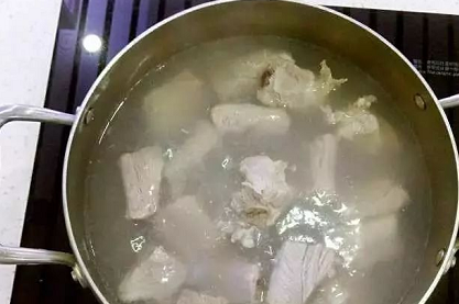 2、然後把仔排放入鍋中,加入純凈水,少許生薑片和黃酒,大火煮開,將仔排焯水後撈出,瀝幹水分備用即可;