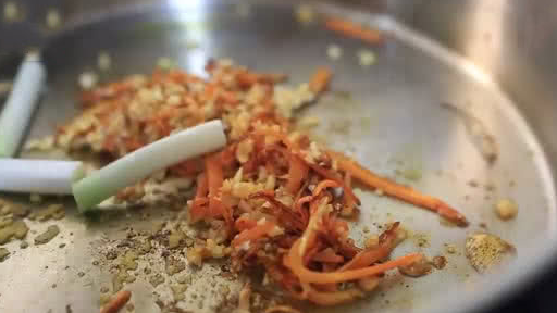 6、然後取出蝦頭,再放入蔥白、蒜末繼續煸炒,等蒜香味出來後,再加入少許的米酒,趁著鍋熱熗一下,讓它的酒香味充分的釋放出來。