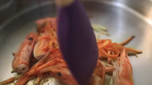 5、鍋燒熱放入適量的底油,先將馬鈴薯絲炒熟炒軟,再放入蘿卜絲和蝦頭,開大火爆出香味,煎的過程中用鏟子把裡頭的蝦膏給擠出來。
