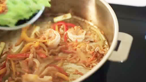 7、接著將彩椒絲和肉絲下入鍋中,直到炒至變色後,再放入蝦肉和卷心菜,前後的順序不可亂,各種食材的成熟度不同,如果改變會大大影響口感。