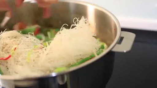 8、然後放入豆芽和米粉(提前用涼水泡發2-3分鐘),二者是天然的絕配,炒軟後再倒入準備好的柴魚高湯,放上它就有港式的風味,其他地方無此類做法。