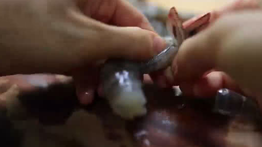 3、將白蝦去頭剝殼,挑出黑線,再開背,蝦頭單獨裝一碗,另有用處,放置一旁備用。