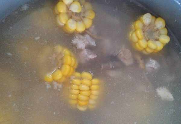 第五步:鍋中水燒開後,將排骨連同高湯倒入鍋中,然後鍋中加入適量的蔥薑片,改用中火煮約20分鐘,即可20分鐘後再煮。打開鍋蓋,將切好的玉米片放入鍋中,再在鍋中加入少許陳醋和食鹽,煮約10分鐘後熄火。重新加熱肋眼湯即可上桌。