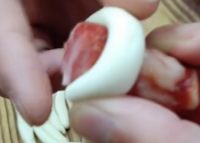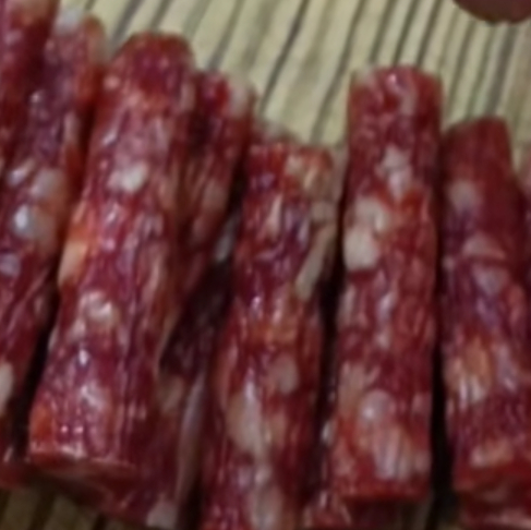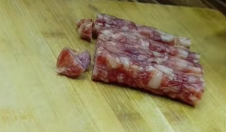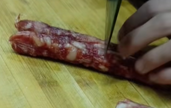 購買的臘腸一般比買的火腿腸還要長一些,用刀從中間一切兩半,兩頭的接口切掉(掐頭去尾),放置備用。
