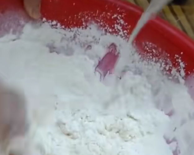 ③酵母白糖水分次倒入面粉中,邊倒邊攪拌成面絮。