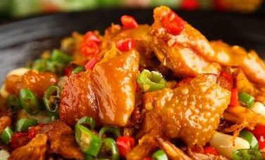 (4)開餐前,先撈去紗佈包不用,再將凈鍋上火,註入秘制調味油燒熱後,取750克雞塊入鍋煸炒至緊皮,然後加放豆瓣醬、小米辣、花椒、泡椒等繼續煸炒至出香,等加入燉雞的原湯燒開後,加入鹽、白糖、味精調味。