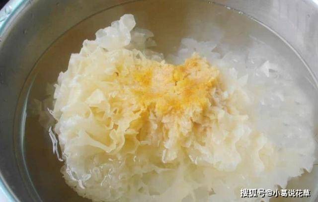 事先將白海綿浸泡,浸泡三四個小時後,再將白海綿清洗幹凈。白蘑菇洗凈後,切成小花。切得越碎越好,這樣更容易生產明膠。切碎後,白蘑菇鍋的接觸面積增加,可以縮短煮的時間。否則,白蘑菇必須燉很長時間才能出膠,甚至要煮幾個小時。