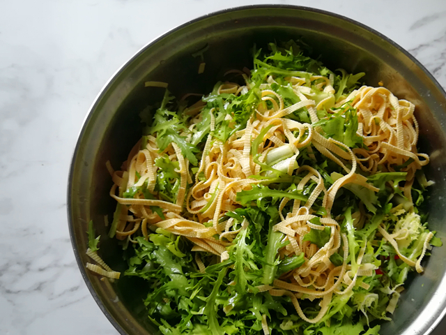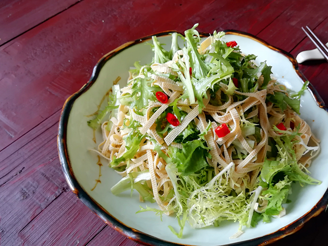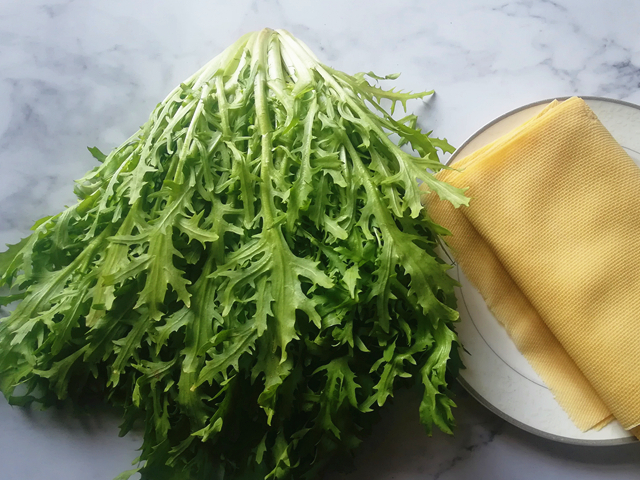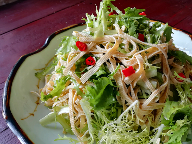 【苦菊拌豆皮】材料:苦菊250克、豆皮3張、泰椒3個、油鹽適量、花椒1/3湯匙、大蒜2瓣、米醋1/2湯匙、白糖1/3湯匙、