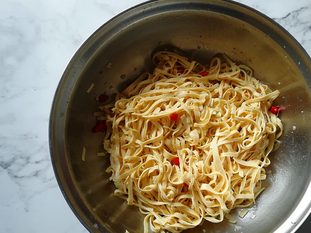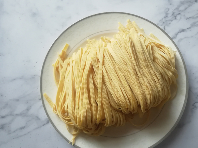 小貼士:豆皮焯水1-2分鐘就可以瞭,口感勁道,焯水後放在冷水中投涼,豆皮絲就不會粘連在一起,花椒要用小火炸至微焦,這樣才能把花椒的味道炸出來。
