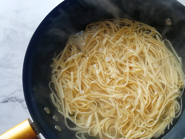 5.鍋加水燒開,下入豆皮焯水1-2分鐘,撈出,放在冷水中投涼,撈出,控凈水,放在盆中待用