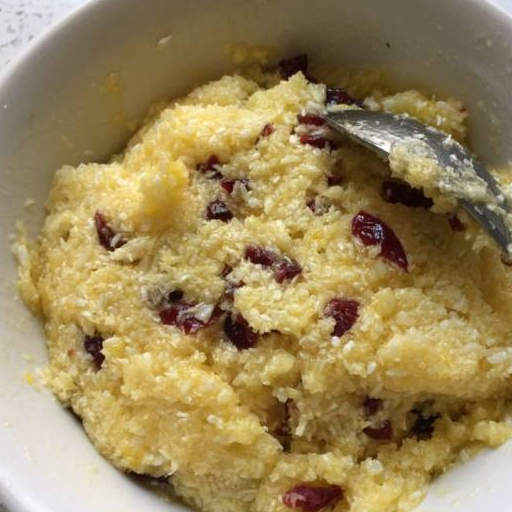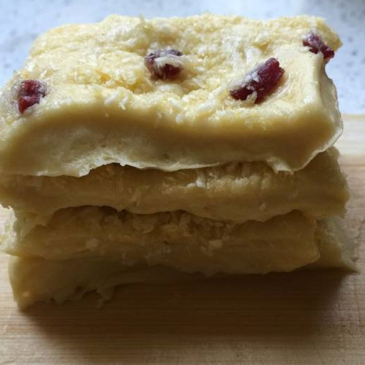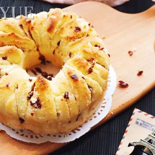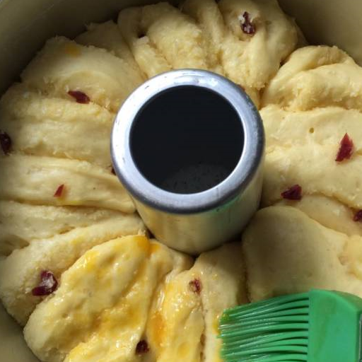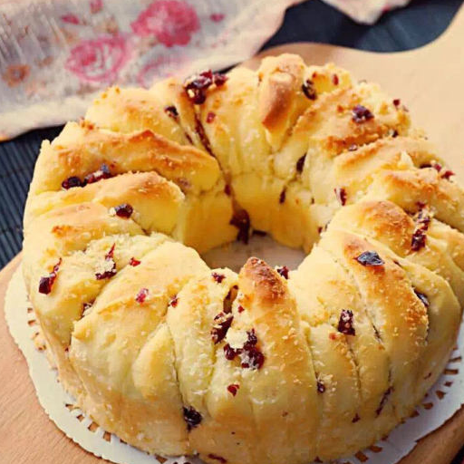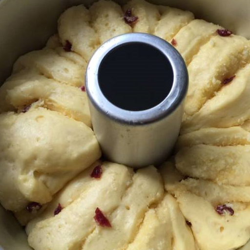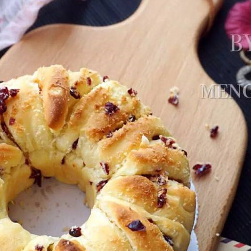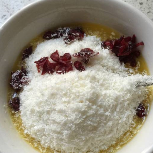 原料:雞蛋、黃油、酵母、鹽、牛奶、高筋面粉、細砂糖、黃油、雞蛋液、細砂糖、蔓越梅幹、椰蓉。