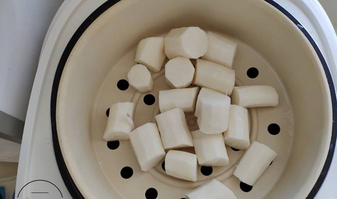 1、山藥戴上手套用刮皮刀刮掉外皮,切成小段放電飯煲蒸熟。