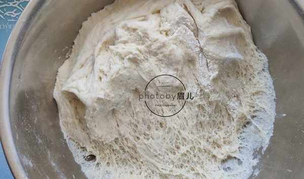 3、中筋面粉加入山藥泥、2湯匙白糖、少許酵母和一些清水,和成軟硬適中的面團,發酵至原來2.5倍大,內部組織成蜂窩狀。