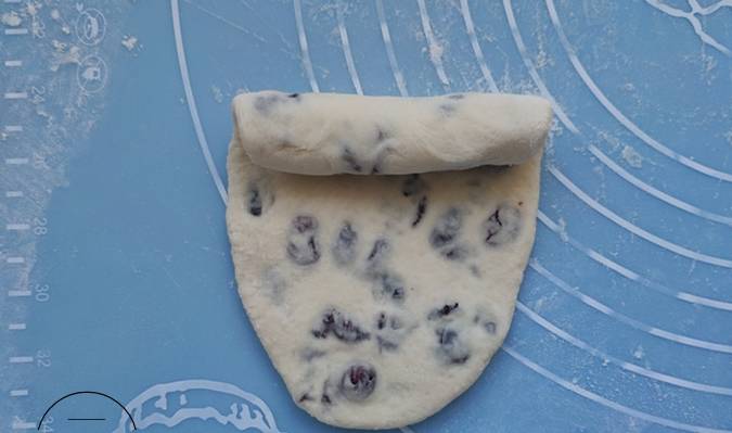 5、取一個小劑子搟成小餅,中間放上蔓越莓,像包包子一樣包好,收緊收口。