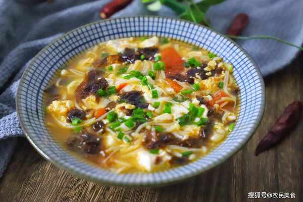 3、把豆腐和金針菇一起放入鍋中,大火煮開後加適量鹽調味,再根據個人的口味加入適量胡椒粉,淋入雞蛋液,再加入一塊紫菜,煮開後加入2勺陳醋和適量胡椒粉,出鍋前加入適量水定粉勾芡,撒入香蔥即可。