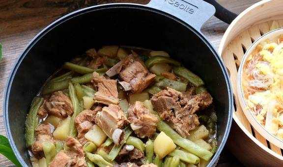 蒸籠下面的湯鍋裡做出來的豆角土豆燉排骨,雖然隻放瞭生抽醬油和少許的冰糖,但鮮咸下飯,色澤也不是非常重,我比較喜歡這種不放油炒,直接燉煮的方法,燉的時間長短決定著排骨的口感,像我傢裡有孩子,我就會燉的時間稍微長一點,比較適合孩子們吃。燉好排骨以後再放上土豆和豆角,上面的蒸屜還可以配合著蒸道菜,節省時間和火力,如果還有別的蒸菜想要做的話,制作這道菜的一個小時裡,同時蒸出兩到三道菜也是可以的。