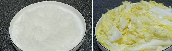 3、把泡軟的粉絲擺到盤中,再把切好的娃娃菜擺到粉絲上面;
