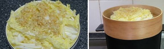 6、把炸好的蒜碎連油帶碎一起澆在娃娃菜上,放進蒸屜,再把蒸屜架到燉排骨土豆豆角的鍋上;