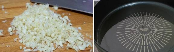 4、大蒜去皮拍扁後切碎,平底煎鍋上火燒熱,放少許食用油到鍋裡;