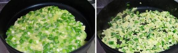 3、把攪拌好的香蔥鵝蛋蛋液倒進鍋裡,待蛋液定型後翻炒至熟即可出鍋裝盤;