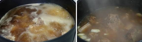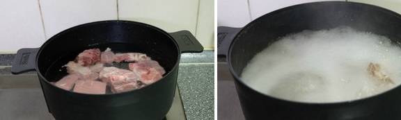 1、排骨剁小塊清洗幹凈後放到湯鍋裡,加上足量的清水,上火燒至水開,煮出血沫,用勺子撇去血沫;