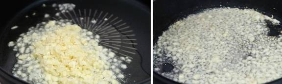 5、把切好的蒜碎放到油裡,小火炸出香味;
