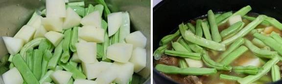 3、燉煮排骨的同時,把豆角去豆筋掰成小段,土豆去皮切成小塊,用清水沖洗幹凈後放進燉煮後的排骨鍋裡,一起燉煮。