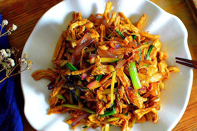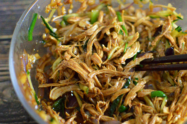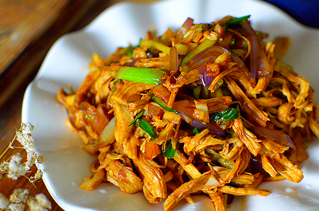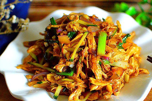 這盤涼拌雞胸肉就做好咯,雞胸肉煮好後吃起來會有點老,但把它撕碎後吃起來卻很有嚼頭,肉絲裡都浸入瞭料汁,特別入味,可以當做小吃或下飯菜。
