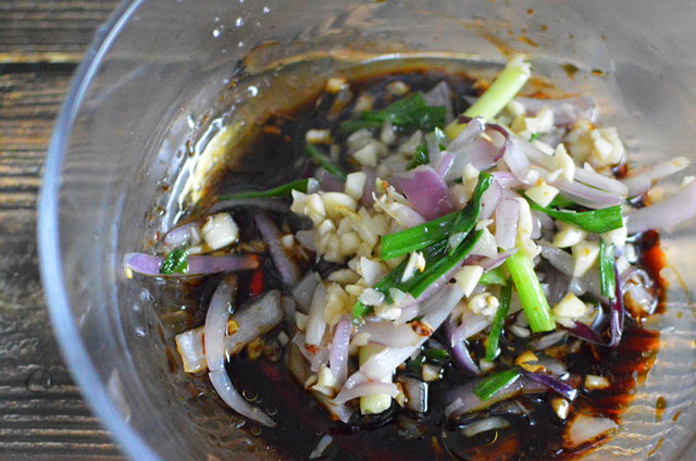 4.碗中倒入一勺生抽、老抽、香醋、香麻油和少許白糖,把炒熱的配菜倒入碗中,迅速攪拌均勻備用。