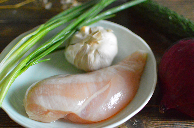 【食材】雞胸肉一塊、洋蔥半顆、大蒜頭5瓣、香蔥兩根、黃瓜半根、生抽1勺、老抽一勺、陳醋少許、香麻油少許、白糖少許、