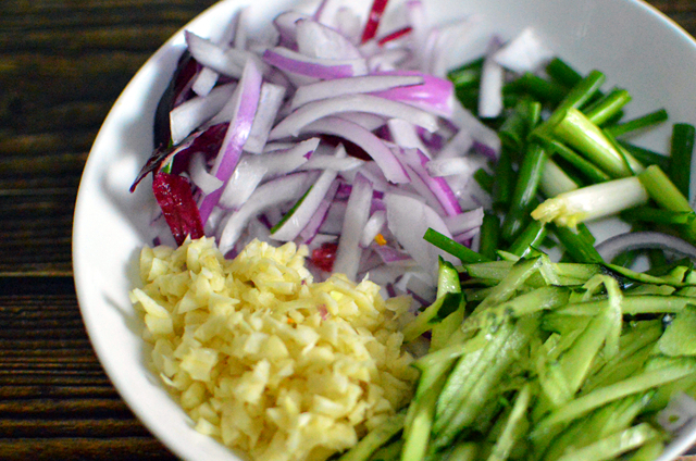 2.黃瓜切成絲,洋蔥、大蒜頭切碎,香蔥切段備用。