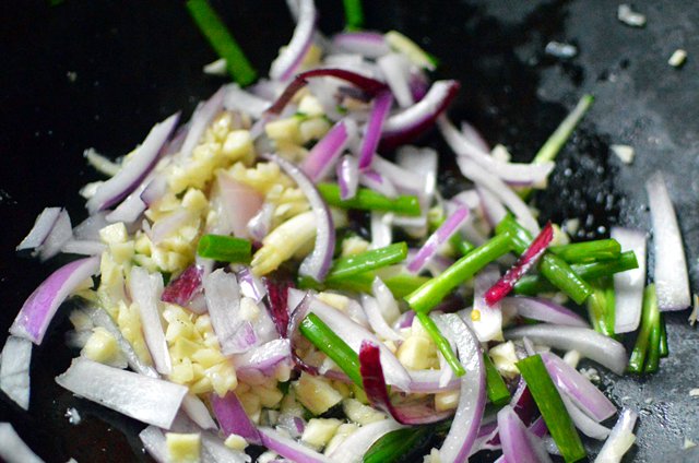3.鍋內倒入少許底油,燒熱後下入大蒜頭、香蔥段和洋蔥炒出香味。