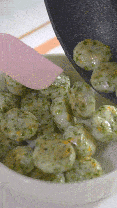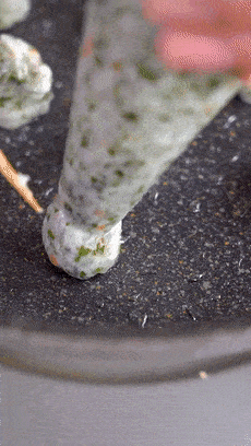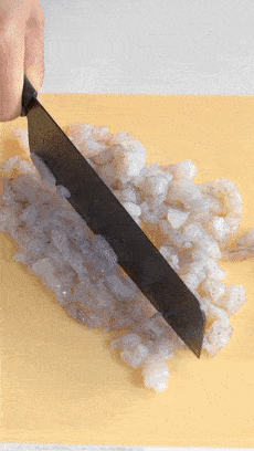 攪好的蝦泥重新裝入裱花袋,或者是厚實的保鮮膜裡,方便一會兒擠出小丸子的造型。如果你們不想這麼麻煩,也可以直接弄成小餅,味道都是一樣的。